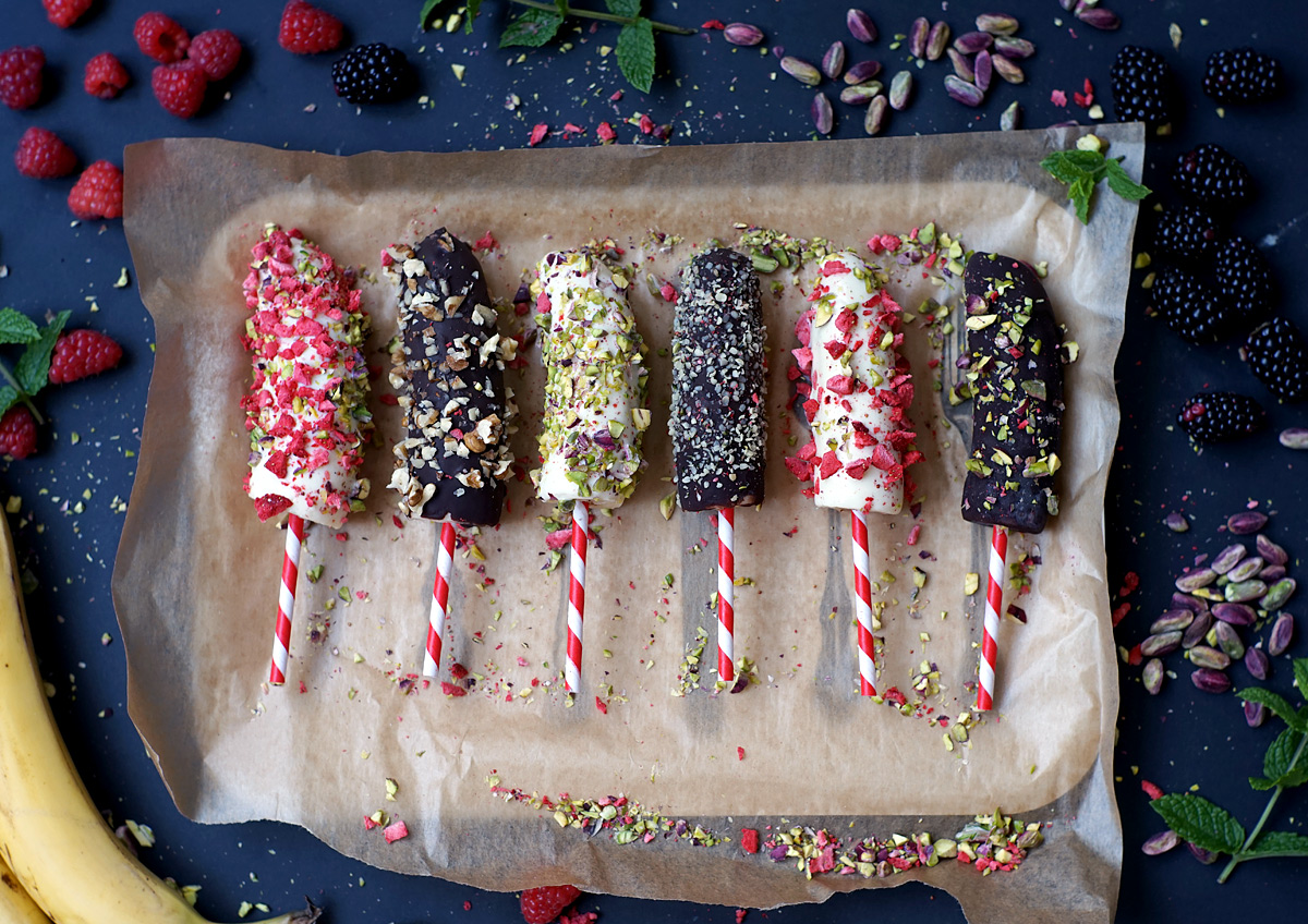 Banány oloupejte (tož kdo by chtěl žmoulat slupku že), rozkrojte na půl (ne podélně :), napíchejte do nich špejle či jakékoliv držátko a nechte nejméně 1 hodinu (pokud máte opravdu výkonný mrazák), ale nejlépe přes noc zmrazit v mrazáku.